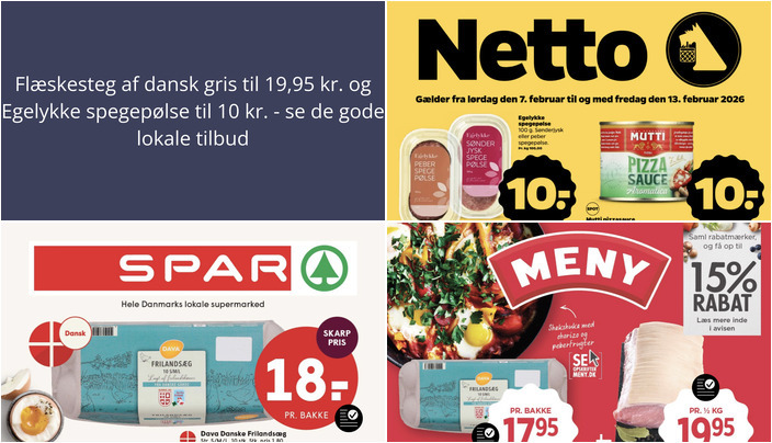 Flæskesteg af dansk gris til 19,95 kr. og Egelykke spegepølse til 10 kr. - se de gode lokale tilbud