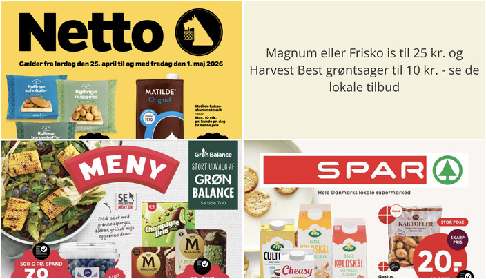 Hos Meny kan du få Magnum eller Frisko is i flere varianter til kun 25 kr. pr. æske. Dette tilbud gælder fra fredag den 24. april til torsdag den 30. april.