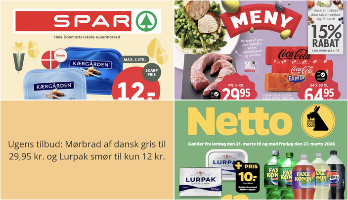 Hos Netto kan du få Lurpak smør eller smørbar til kun 12 kr. pr. 200 g. Med Netto+ app kan du få det til en endnu lavere pris på 10 kr. Tilbuddet gælder fra lørdag den 21. marts til fredag den 27. marts.